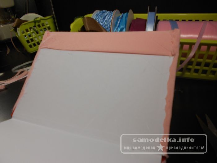 Если ваш ежедневник изначально не конфликтует с цветом обложки, то данный пункт пропустите. В моем случае ежедневник красный, а декор – нежно розовый и белый. Оклеиваем ежедневник двусторонним скотчем, сверху клеим обычный лист бумаги. Лишнее срезаем.
