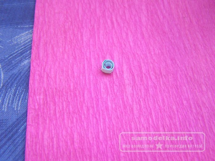 Вот эта приклеенная к открытке голубая штуковина — это серединка цветочка, который мы сделаем в технике квиллинг. Чтобы создать ее (штуковину), отрежем 2 см голубой полоски и свернем в «рулончик» или, еще как это называют, «спираль». Кончик полоски необходимо приклеивать к «телу», начало закреплять необязательно.