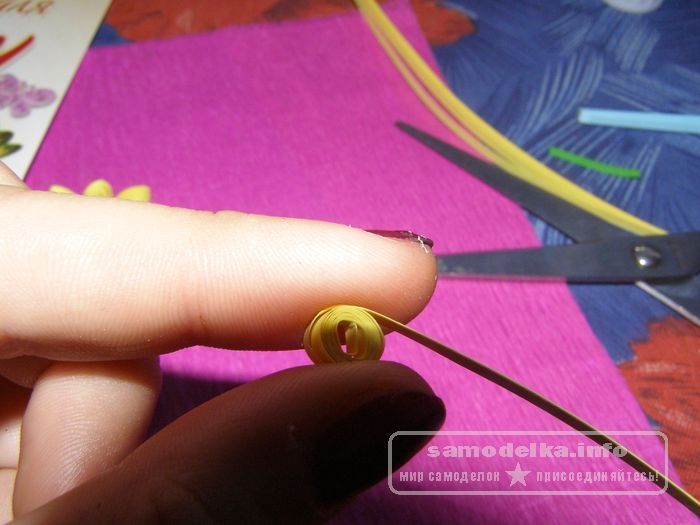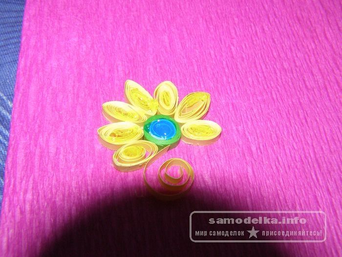 Чтобы его сделать, приклеим желтую спираль к основанию, а затем по очереди смастерим лепестки.