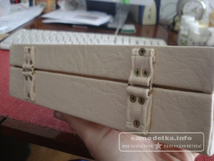 Ручка и застёжка чемоданчика также сделаны из кусочка кожзама, сшитого в полоску, и нарезанного по месту. Пригодилась фурнитура от старой, истёртой, ненужной дамской сумочки… Установлены они также с помощью клея, и маленьких шурупов; застёжка – строго по центру, ручка – с равным отступом от боковых краёв. Величина отступов подгонялась прямо по руке.