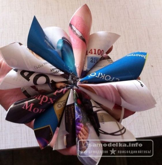 9) Шар готов! Украсьте новогоднюю игрушку как захотите – пуговицами, бусинами, лентами и т.п., если собираетесь вешать на елку, то один лепесточек проткните, просуньте через него ниточку или ленту, красиво завяжите. Смотрите, чтобы нитка или лепесток не порвался при движении, ведь шар получился не такой уж и легкий!