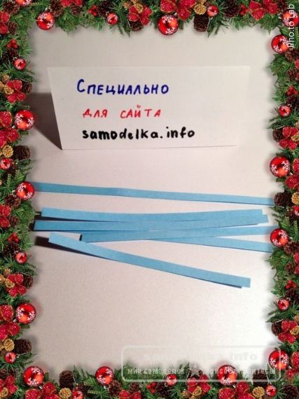 6) Теперь делаем снежинку. Берем 6 голубых полосок по 10 см каждая. Скручиваем из каждой шарик и сжимаем пальцами с двух сторон. Получаем основу для нашей будущей снежинки.