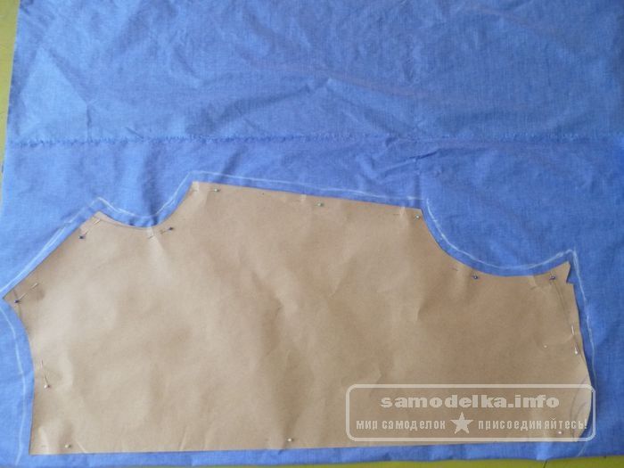 Чтобы ткань не смещалась, прикалываем к ней бумажную выкройку булавками.