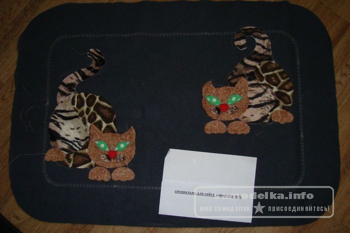 Для начала определимся с размерами коврика и соответственно с расположением и размером аппликаций. У нас это будут два кота, играющие с клубком.