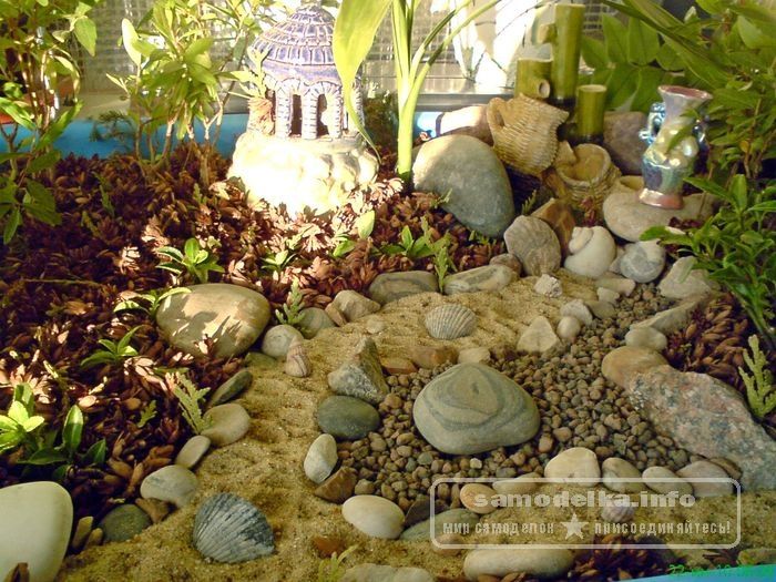 Вот и мне также захотелось разбавить горшки красивым ландшафтом. А, так как из-за нехватки места я давно пристрастилась забонсаивать своих питомцев, то идея японского садика пришлась как нельзя кстати. За идеями зашла в интернет, их там можно купить готовыми, на любой вкус. Но так хочется сделать самой, ведь приносит удовлетворение не столько результат, сколько процесс. Не могу не высказать своего удивления по поводу одного из продававшихся образцов – ящичка с песком, больше смахивающего на кошачий туалет, и лежащих в нем грабелек и двух камушков. Вроде как уставший бизнесмен будет расслабляться, двигая камушки и причесывая песок? Флаг, то бишь грабли ему в руки, а я сделаю все сама!